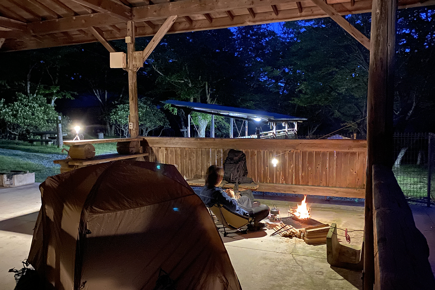 雨の多い時期でも濡れずに【設営&焚き火】が楽しめます。